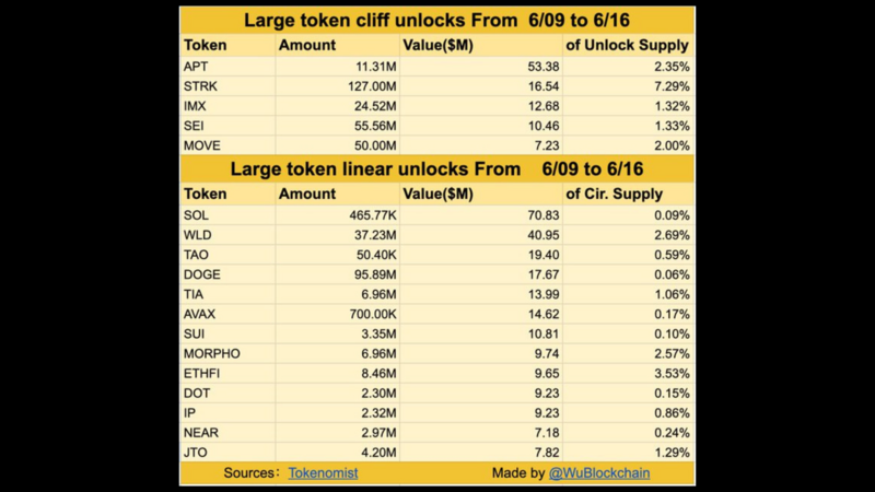 Pelepasan token sekaligus yang bernilai lebih dari $5 juta meliputi proyek-proyek seperti APT, STRK, IMX, SEI, dan MOVE. Di antaranya, STRK akan melepaskan 127 juta token dengan nilai $16,54 juta (7,29% dari total pasokan yang terkunci), sementara SEI akan melepas 55,56 juta token senilai $10,46 juta (1,33% dari pasokan terkunci). Sementara itu, pelepasan bertahap harian dengan nilai lebih dari $1 juta per hari melibatkan token seperti SOL, WLD, TIA, DOGE, TAO, AVAX, SUI, DOT, IP, MORPHO, NEAR, ETHFI, dan JTO. Token WLD, misalnya, akan melepas 37,23 juta token senilai $40,95 juta (2,69% dari pasokan yang beredar), dan DOGE akan melepas 95,89 juta token senilai $17,67 juta (0,06% dari pasokan yang beredar).
